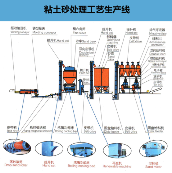 ● 粘土砂是以粘土為粘結(jié)劑配置的型(砂)芯,砂處理工部是鑄造車間的重要組成部分,其主要任務就是為造型制芯工部提供合格的型砂和芯砂。